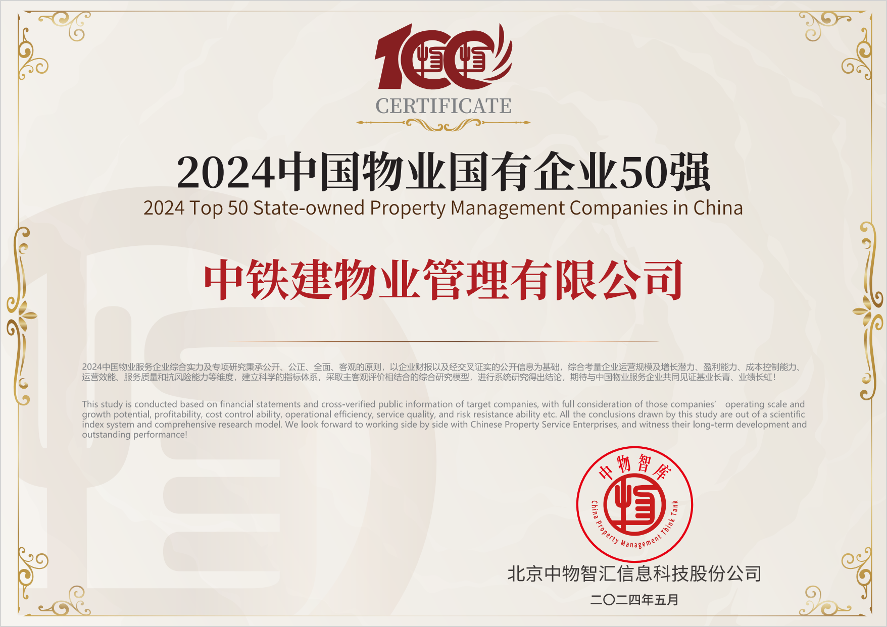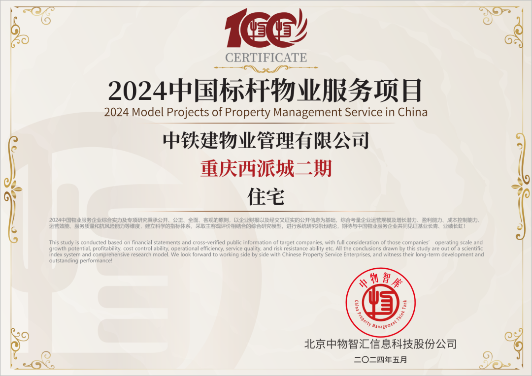 其中,中铁建物业管理有限公司荣获“2024中国物业服务综合实力百强企业 第14名”“2024中国物业国有企业50强”及子榜“2024中国物业服务企业华北30强”“2024中国标杆物业服务项目”奖项。