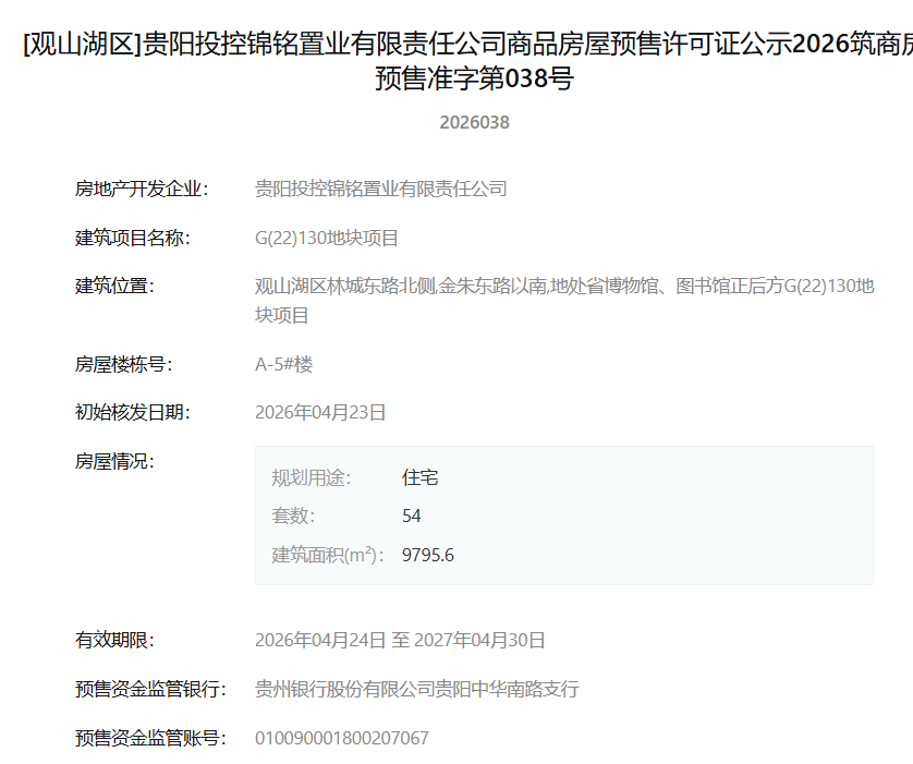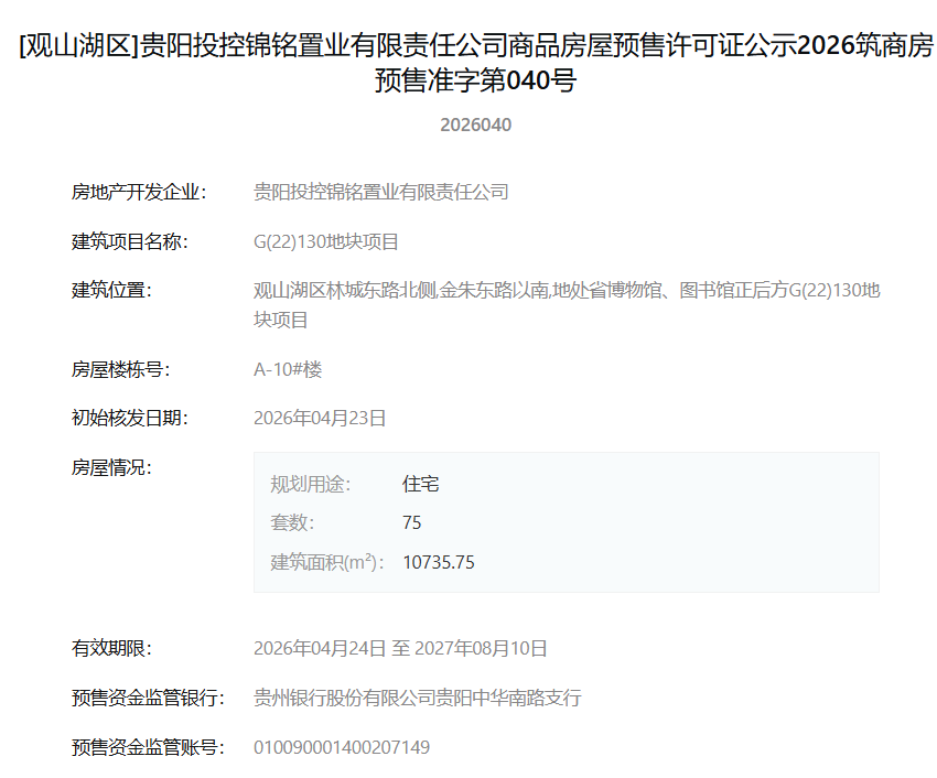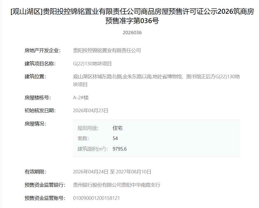 4月27日,据筑房网消息,贵阳市观山湖区G(22)130地块项目(即观山湖金融城投控融媒体地块)四栋住宅楼同时获得预售许可,共计推出239套住宅房源。